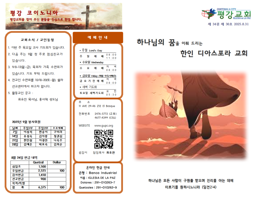 2025년 8월 31일 주일예배 주보 페이지 정보 작성자 과테말라평강교회 댓글 0건 조회 119회 작성일 25-08-29 18:47 목록 본문 2025년 8월 31일 주일예배 주보 이전글2025년 9월 7일 주일예배 주보 25.09.07 다음글2025년 8월 24일 주일예배 주보 25.08.24 댓글 0 댓글목록 등록된 댓글이 없습니다.