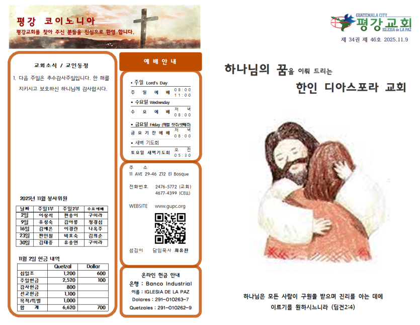 2025년 11월 9일 주일예배 주보 페이지 정보 작성자 과테말라평강교회 댓글 0건 조회 48회 작성일 25-11-07 18:49 목록 본문 2025년 11월 9일 주일예배 주보 이전글2025년 11월 16일 주일예배 주보 25.11.16 다음글2025년 11월 2일 주일예배 주보 25.10.31 댓글 0 댓글목록 등록된 댓글이 없습니다.