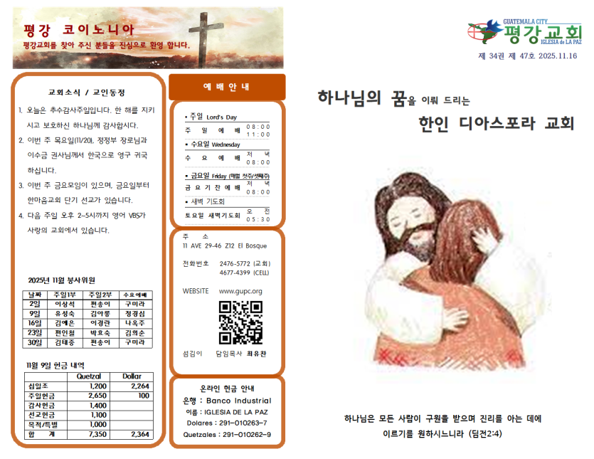 2025년 11월 16일 주일예배 주보 페이지 정보 작성자 과테말라평강교회 댓글 0건 조회 11회 작성일 25-11-16 07:21 목록 본문 2025년 11월 16일 주일예배 주보 다음글2025년 11월 9일 주일예배 주보 25.11.07 댓글 0 댓글목록 등록된 댓글이 없습니다.